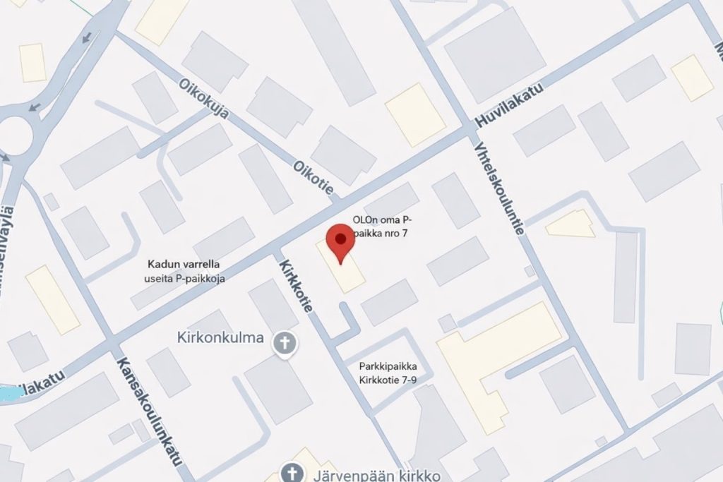 - Kirkon yläparkkipaikalle, talon toisessa päässä (Kirkkotie 7–9)